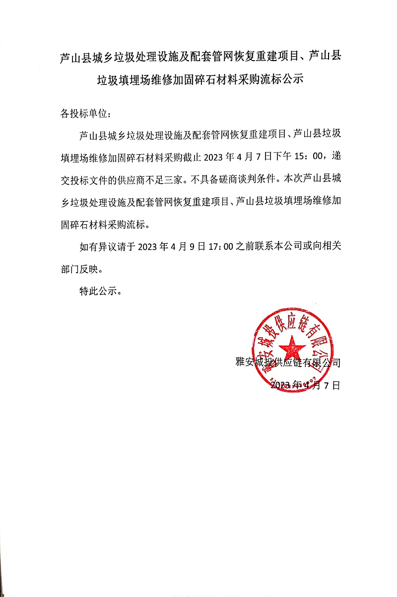 蘆山縣城鄉(xiāng)垃圾處理設施及配套管網恢復重建項目、蘆山縣垃圾填埋場維修加固碎石材料采購流標公示