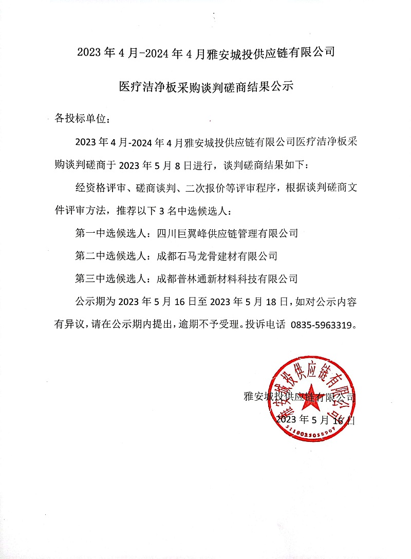 2023年4月-2024年4月雅安城投供應(yīng)鏈有限公司醫(yī)療潔凈板采購談判磋商結(jié)果公示