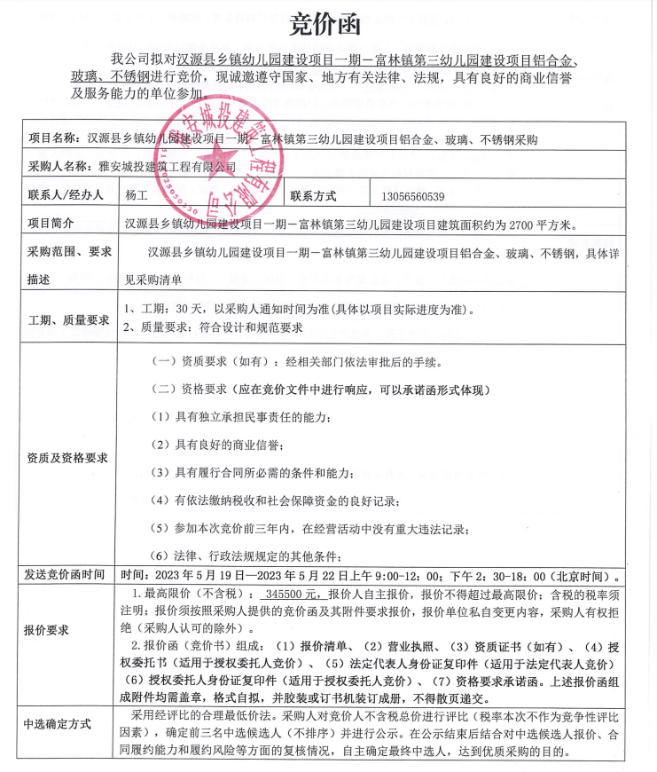 漢源縣鄉(xiāng)鎮(zhèn)幼兒園建設(shè)項(xiàng)目一期一富林鎮(zhèn)第三幼兒園建設(shè)項(xiàng)目鋁合金、玻璃、不銹鋼采購(gòu)競(jìng)價(jià)公告