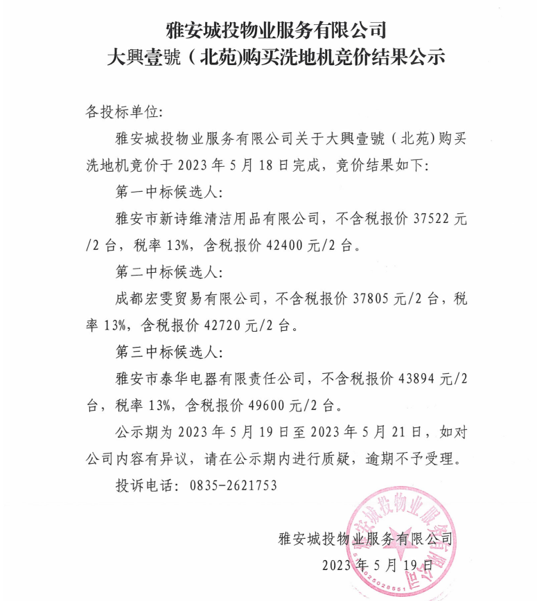 雅安城投物業(yè)服務有限公司大興壹號(北苑)購買洗地機競價結(jié)果公示