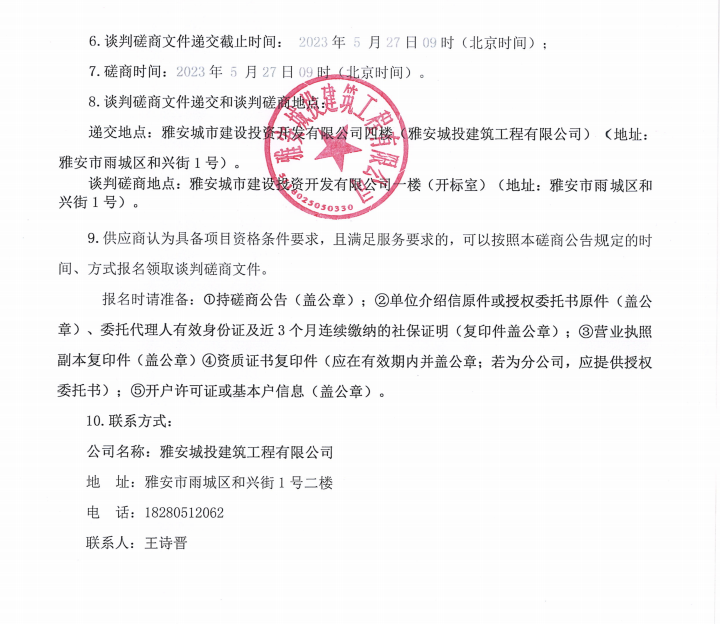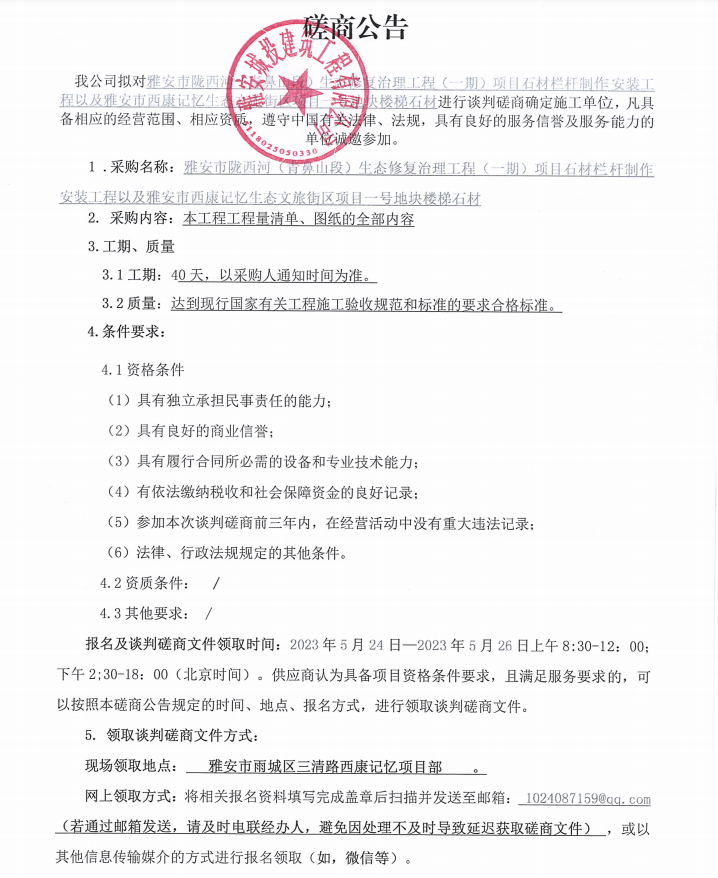 雅安市隴西河(青鼻山段)生態(tài)修復(fù)治理工程(一期)項目石材欄桿制作安裝工程以及雅安市西康記憶生態(tài)文旅街區(qū)項目一號地塊樓梯石材談判磋商公告