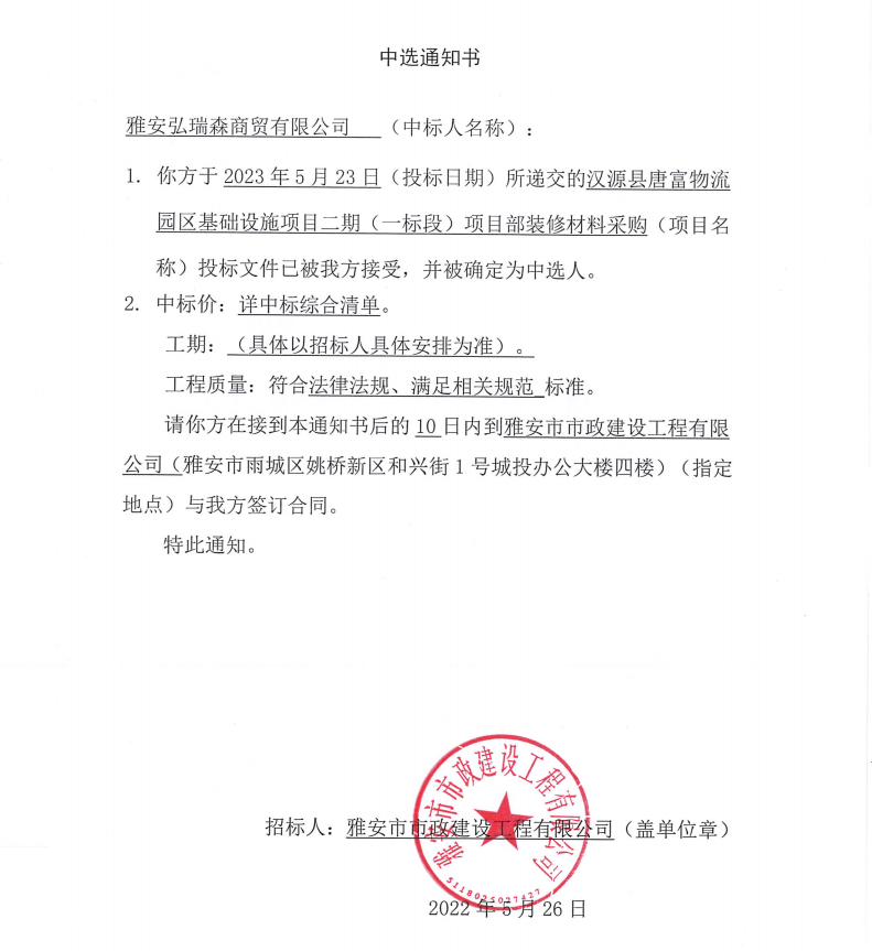 漢源縣唐富物流園區(qū)基礎(chǔ)設(shè)施項(xiàng)目二期(一標(biāo)段)項(xiàng)目部裝修材料采購(gòu)中選通知書(shū)