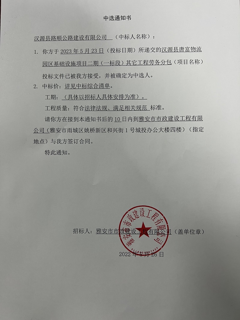 漢源縣唐富物流園區(qū)基礎(chǔ)設(shè)施項(xiàng)目二期(一標(biāo)段)其它工程勞務(wù)分包中選通知書(shū)