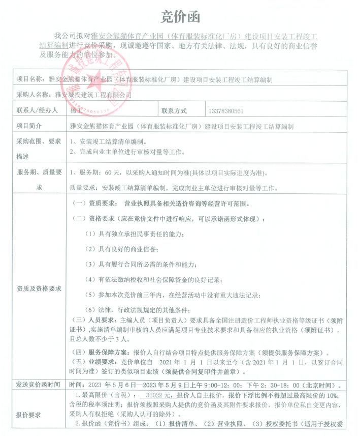 雅安金熊貓?bào)w育產(chǎn)業(yè)園(體育服裝標(biāo)準(zhǔn)化廠房)建設(shè)項(xiàng)目安裝工程竣工結(jié)算編制競價(jià)公告