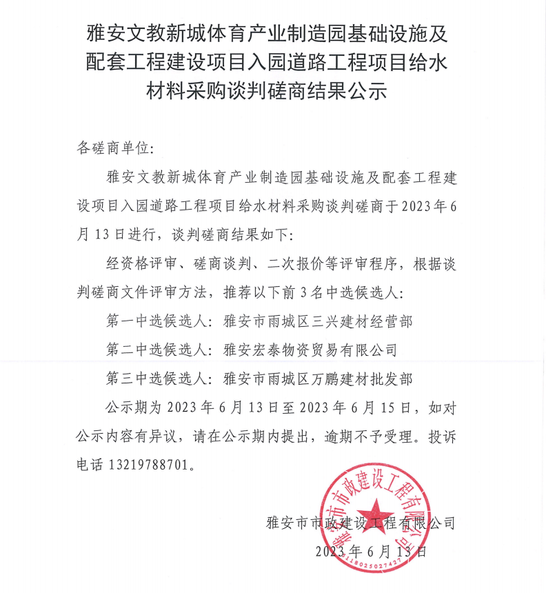 雅安文教新城體育產(chǎn)業(yè)制造園基礎(chǔ)設(shè)施及配套工程建設(shè)項目入園道路工程項目給水材料采購談判磋商結(jié)果公示
