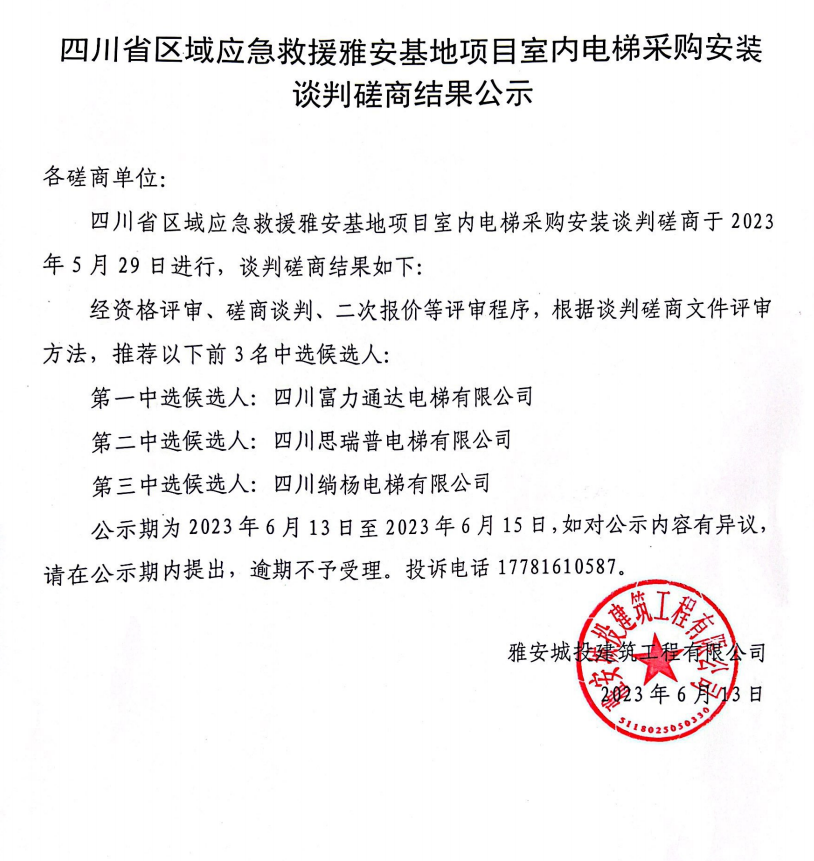 四川省區(qū)域應急救援雅安基地項目室內電梯采購安裝談判磋商結果公示