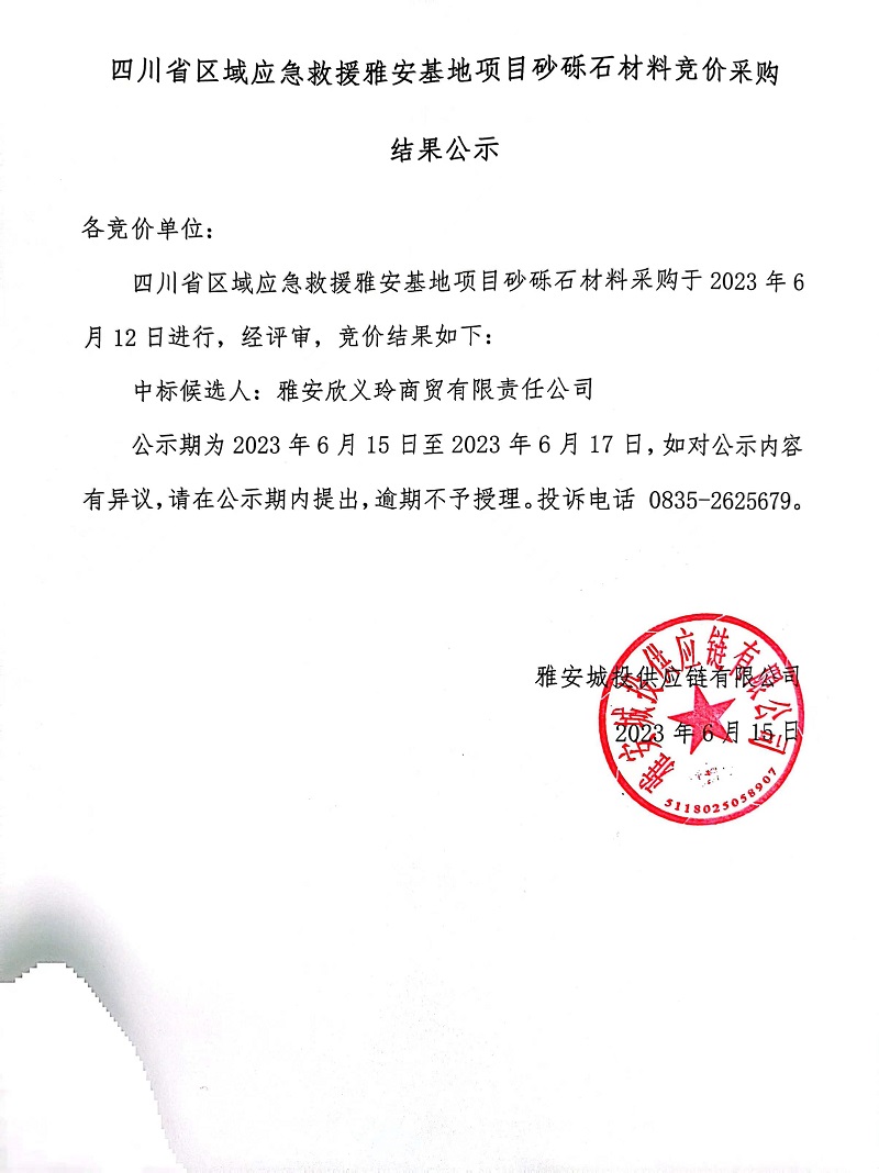 四川省區(qū)域應(yīng)急救援雅安基地項(xiàng)目砂礫石材料競(jìng)價(jià)采購(gòu)結(jié)果公示