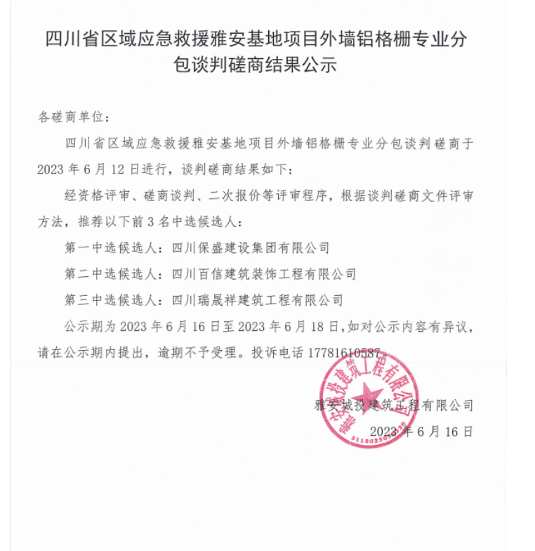 四川省區(qū)域應(yīng)急救援雅安基地項(xiàng)目外墻鋁格柵專業(yè)分包談判磋商結(jié)果公示