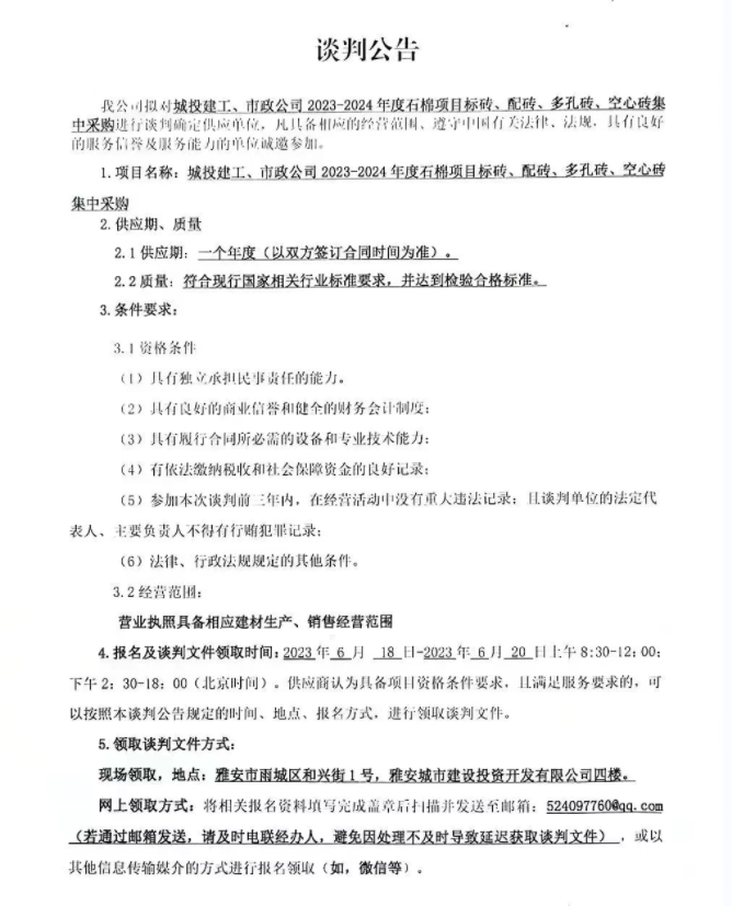 城投建工、市政公司2023-2024年度石棉項(xiàng)目標(biāo)磚、配磚、多孔磚、空心磚集中采購談判公告