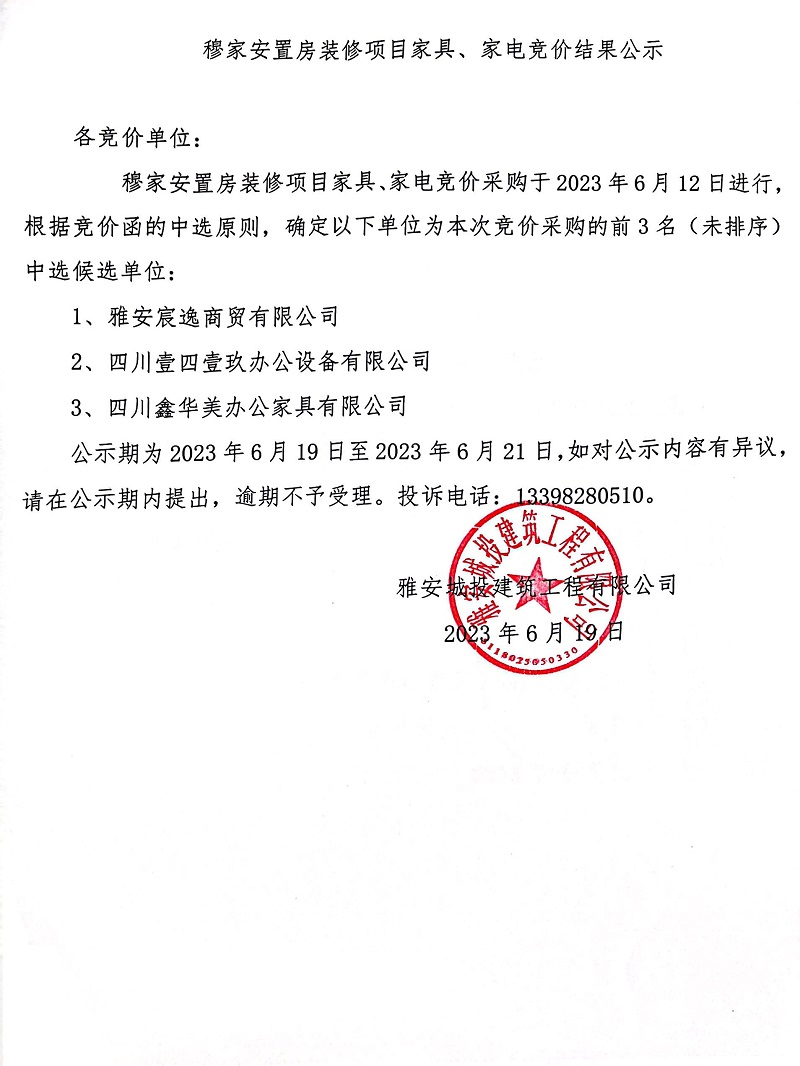 穆家安置房裝修項目家具、家電競價結(jié)果公示