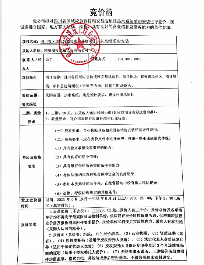 四川省區(qū)域應(yīng)急救援雅安基地項(xiàng)目熱水系統(tǒng)采購安裝競價(jià)公告