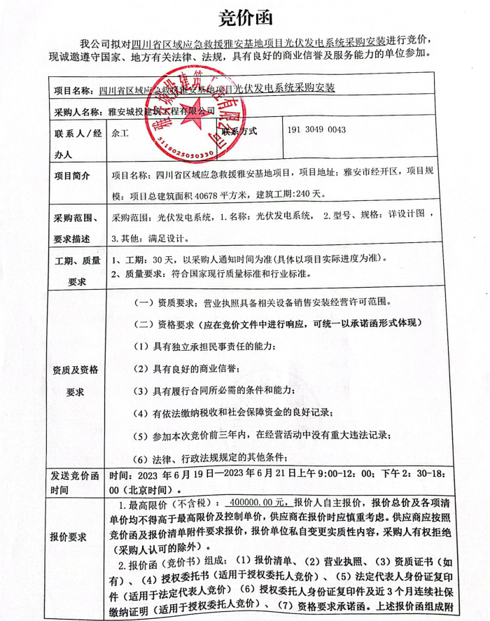 四川省區(qū)域應急救援雅安基地項目光伏發(fā)電系統(tǒng)采購安裝競價公告