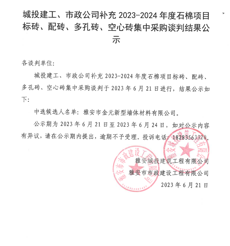 城投建工、市政公司補(bǔ)充2023-2024年度石棉項目標(biāo)磚、配磚、多孔磚、空心磚集中采購談判結(jié)果公示