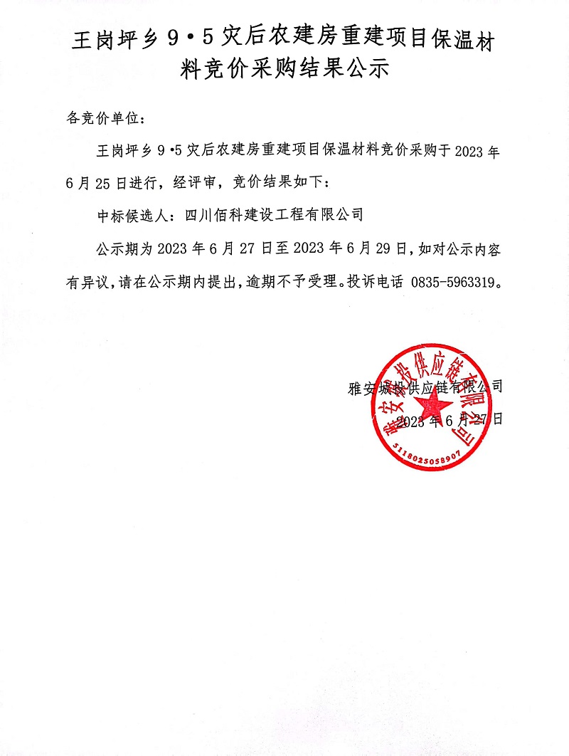 王崗坪鄉(xiāng)9·5災(zāi)后農(nóng)建房重建項目保溫材料競價采購結(jié)果公示
