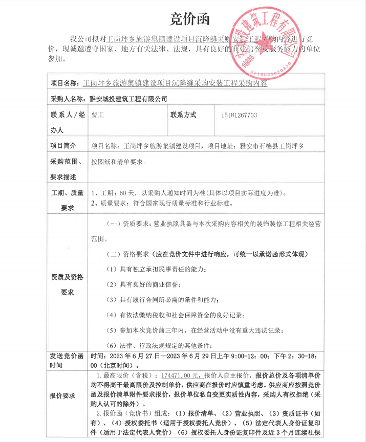 王崗坪鄉(xiāng)旅游集鎮(zhèn)建設(shè)項(xiàng)目沉降縫采購安裝工程采購內(nèi)容競(jìng)價(jià)公告