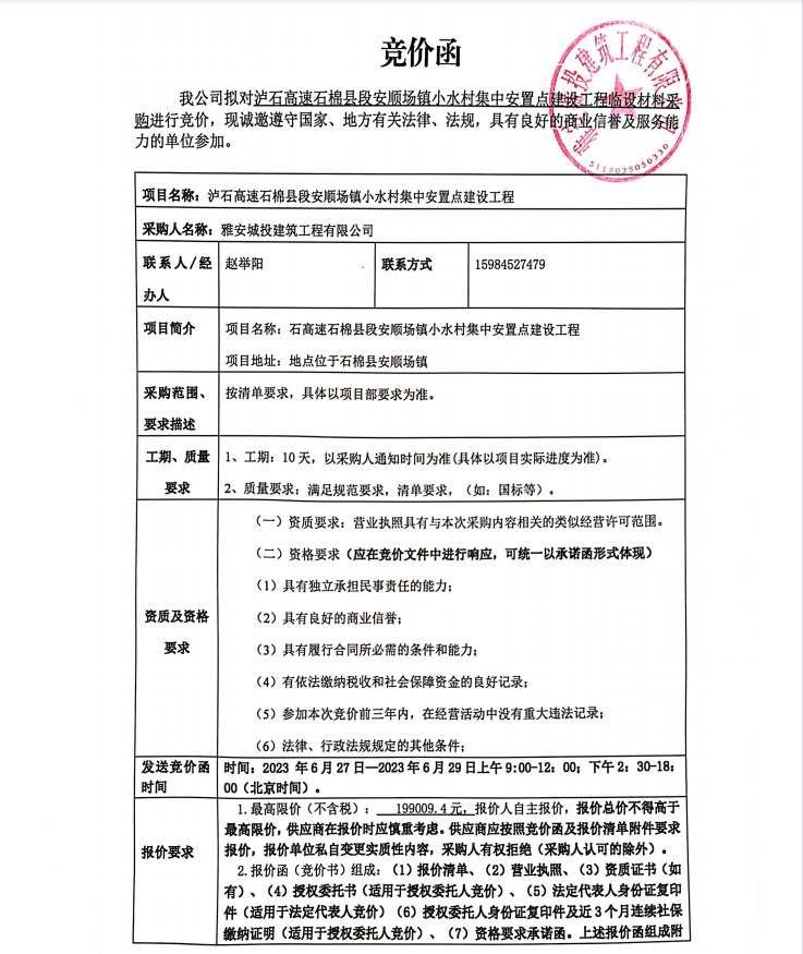 瀘石高速石棉縣段安順場鎮(zhèn)小水村集中安置點建設(shè)工程臨設(shè)材料采購競價公告