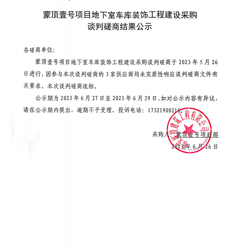 蒙頂壹號項目地下室車庫裝飾工程建設采購談判磋商結果公示