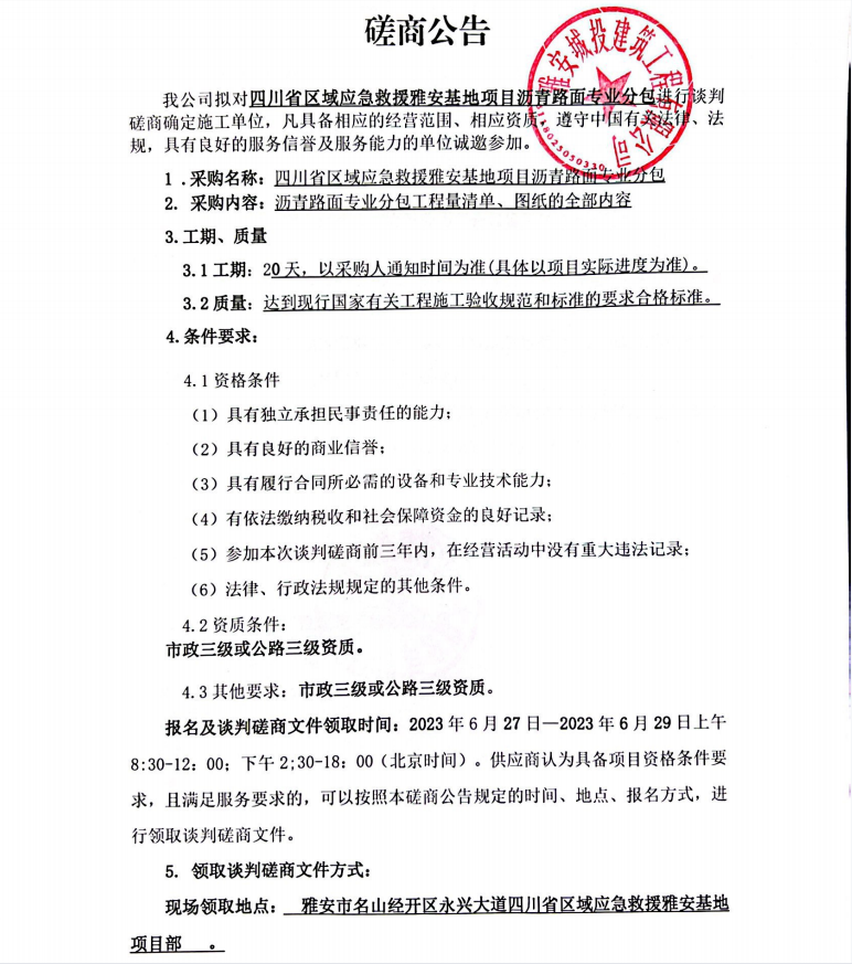 四川省區(qū)域應(yīng)急救援雅安基地項(xiàng)目瀝青路面專業(yè)分包談判磋商公告