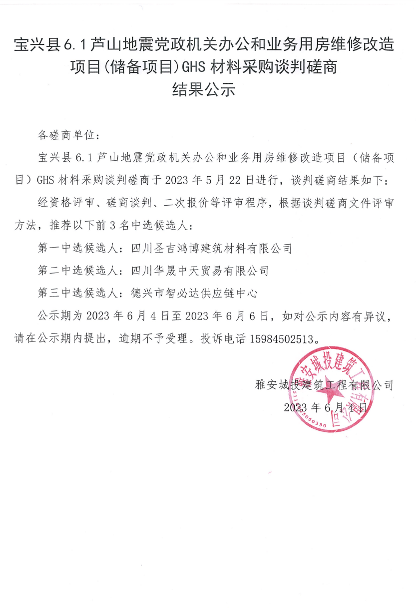 寶興縣6.1蘆山地震黨政機關辦公和業(yè)務用房維修改造項目(儲備項目)GHS材料采購談判磋商結果公示