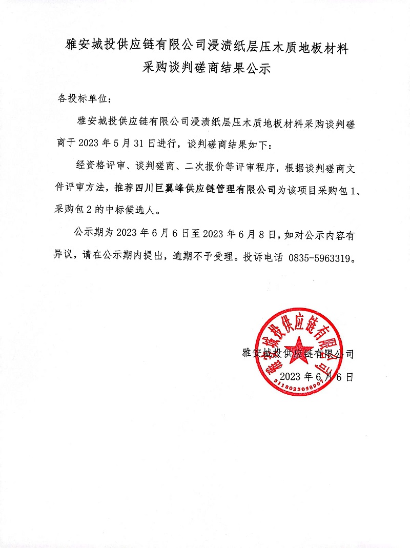 雅安城投供應鏈有限公司浸漬紙層壓木質地板材料采購談判磋商結果公示