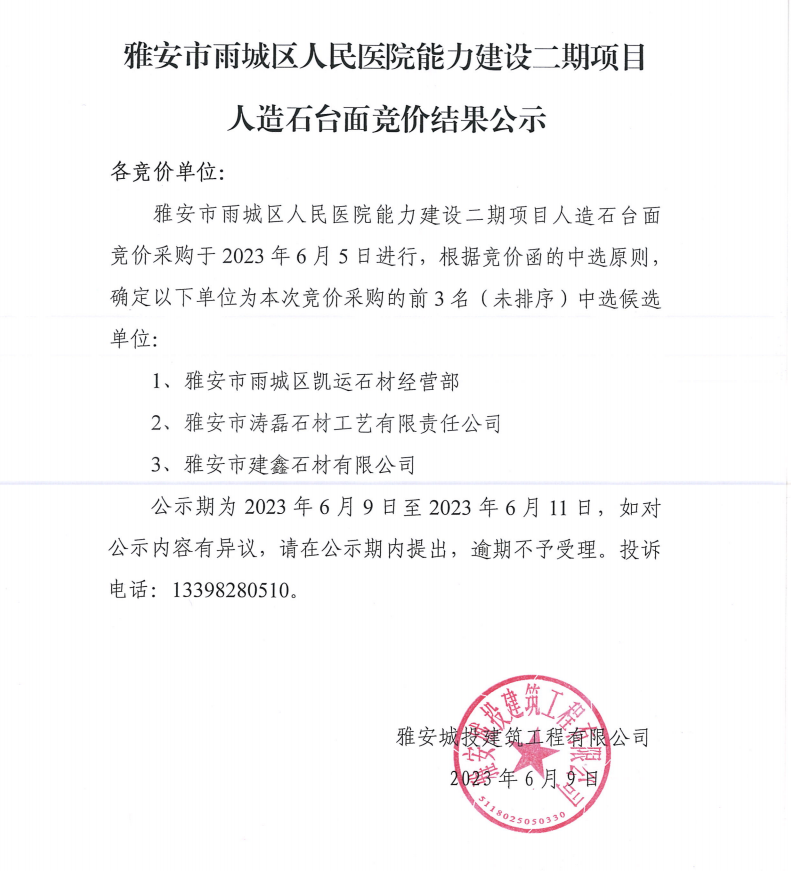 雅安市雨城區(qū)人民醫(yī)院能力建設二期項目人造石臺面競價結果公示