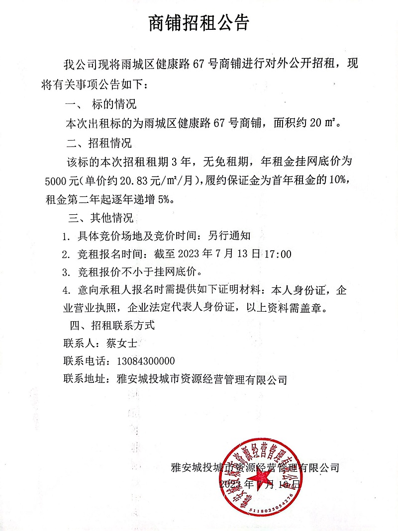 雨城區(qū)健康路67號(hào)商鋪招租公告
