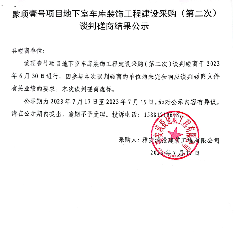 蒙頂壹號(hào)項(xiàng)目地下室車庫(kù)裝飾工程建設(shè)采購(gòu)(第二次)談判磋商結(jié)果公示