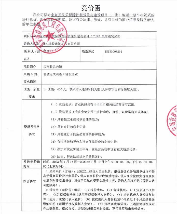 寶興縣靈關(guān)保障性租賃住房建設(shè)項(xiàng)目(二期)混凝土泵車租賃采購(gòu)競(jìng)價(jià)公告