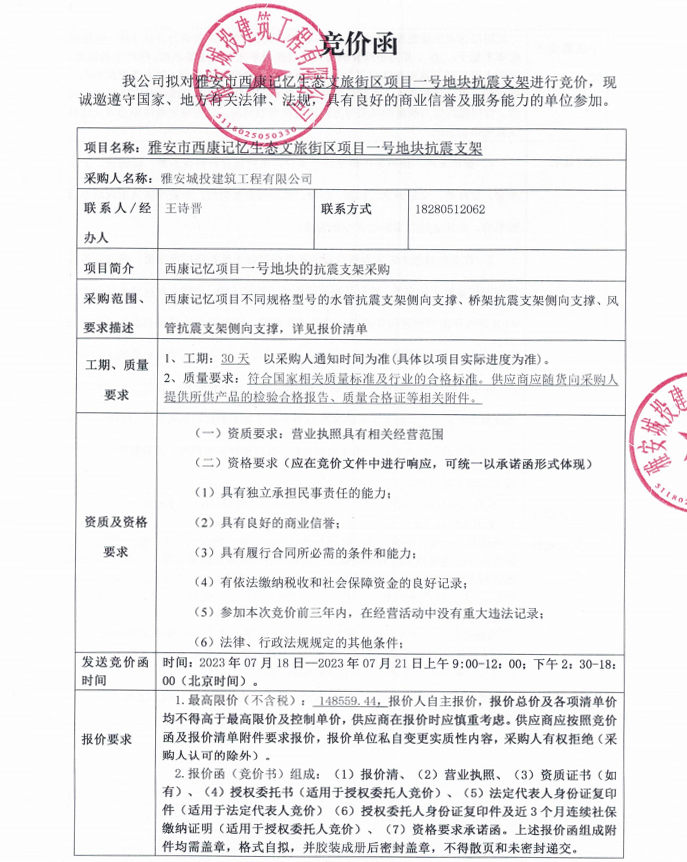 雅安市西康記憶生態(tài)文旅街區(qū)項(xiàng)目一號(hào)地塊抗震支架競(jìng)價(jià)采購(gòu)公告