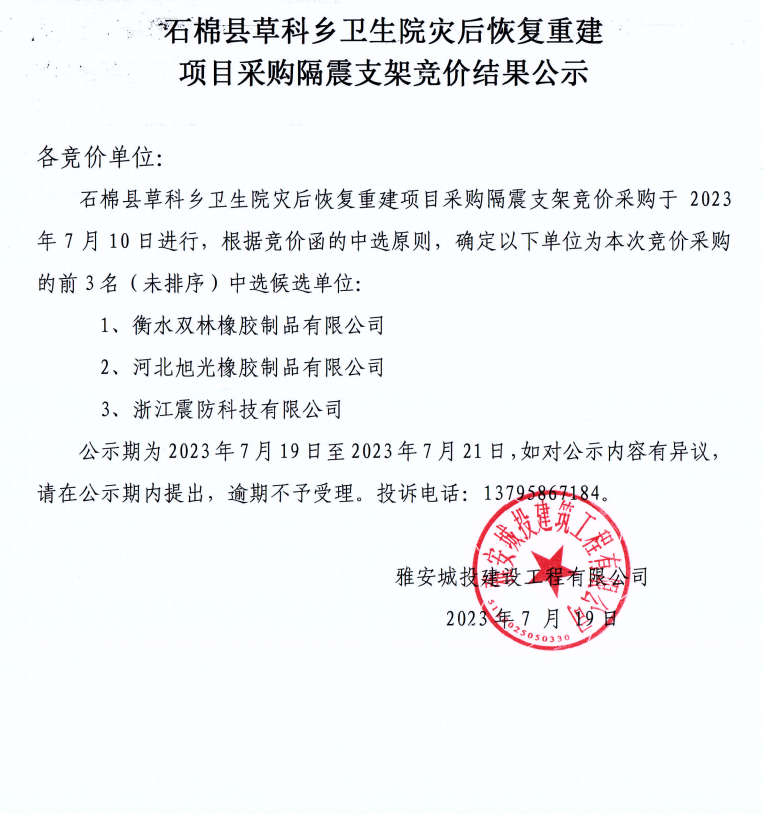 石棉縣草科鄉(xiāng)衛(wèi)生院災(zāi)后恢復(fù)重建項目采購隔震支架競價結(jié)果公示