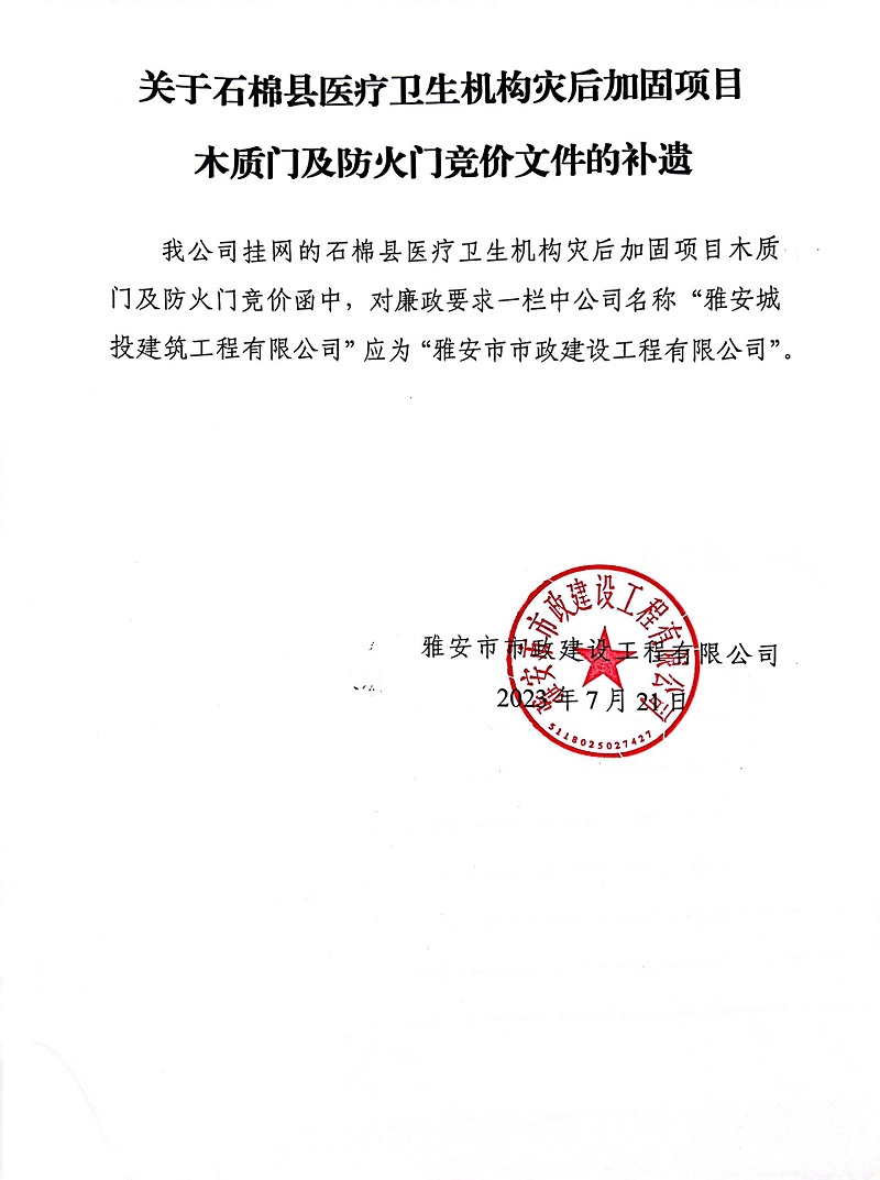關(guān)于石棉縣醫(yī)療衛(wèi)生機(jī)構(gòu)災(zāi)后加固項(xiàng)目木質(zhì)門(mén)及防火門(mén)競(jìng)價(jià)文件的補(bǔ)遺