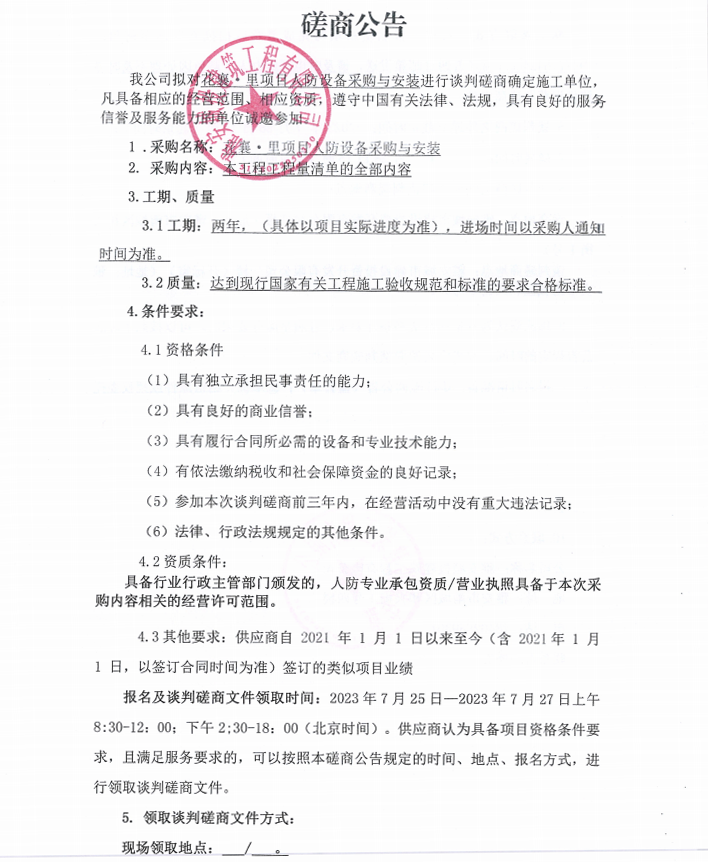 漢源縣花襄·里項(xiàng)目人防設(shè)備采購(gòu)與安裝談判磋商公告