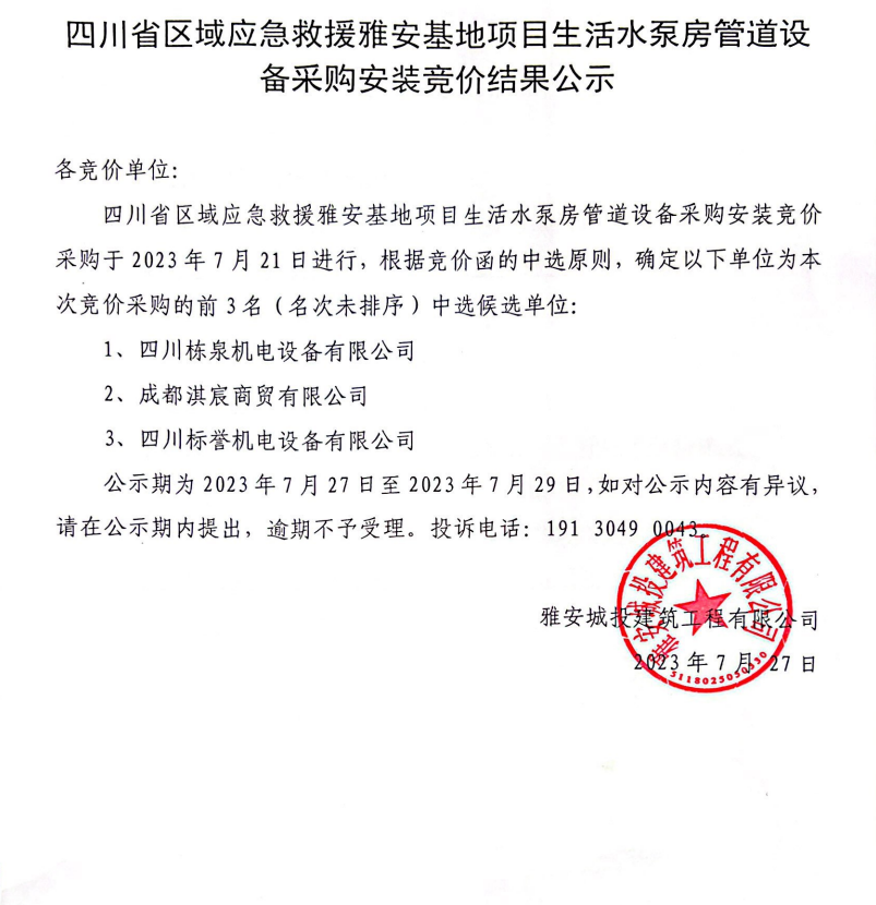 四川省區(qū)域應(yīng)急救援雅安基地項目生活水泵房管道設(shè)備采購安裝競價結(jié)果公示