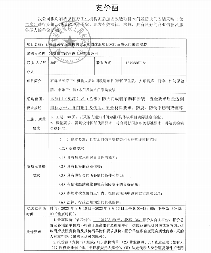 石棉縣醫(yī)療衛(wèi)生機(jī)構(gòu)災(zāi)后加固改造項目木門及防火門安裝采購(第二次)競價公告