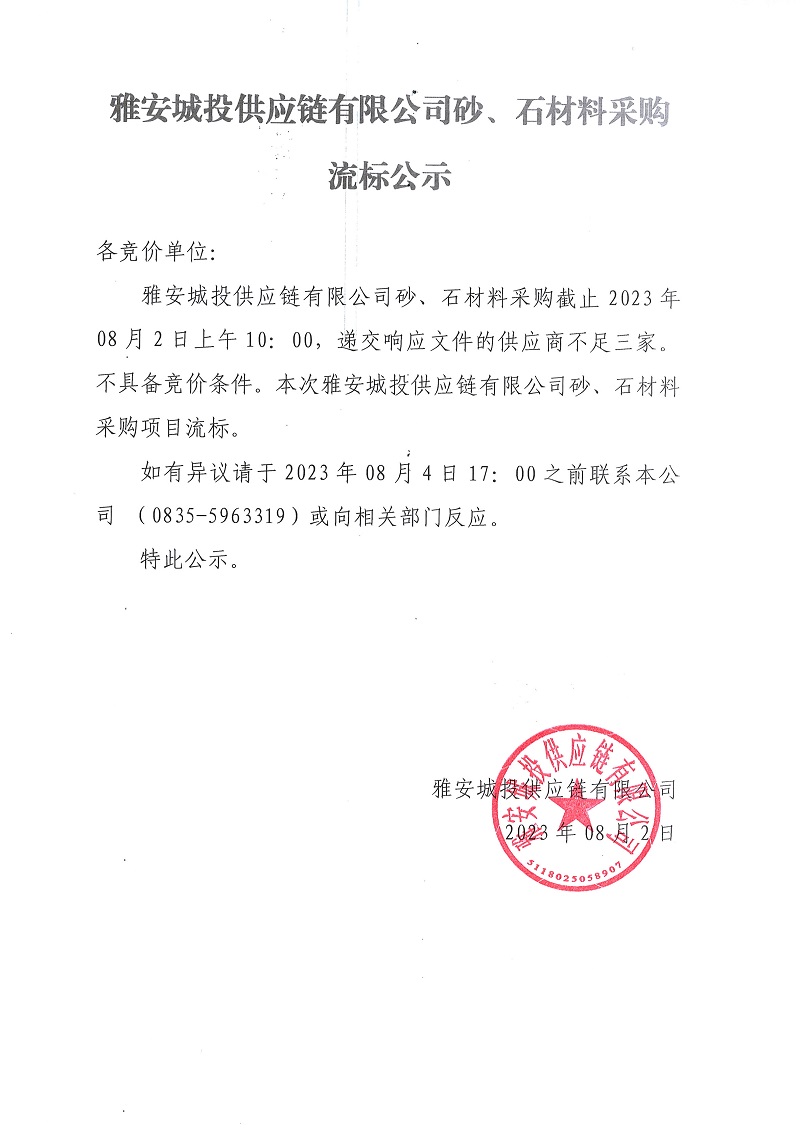雅安城投供應鏈有限公司砂、石材料采購流標公示