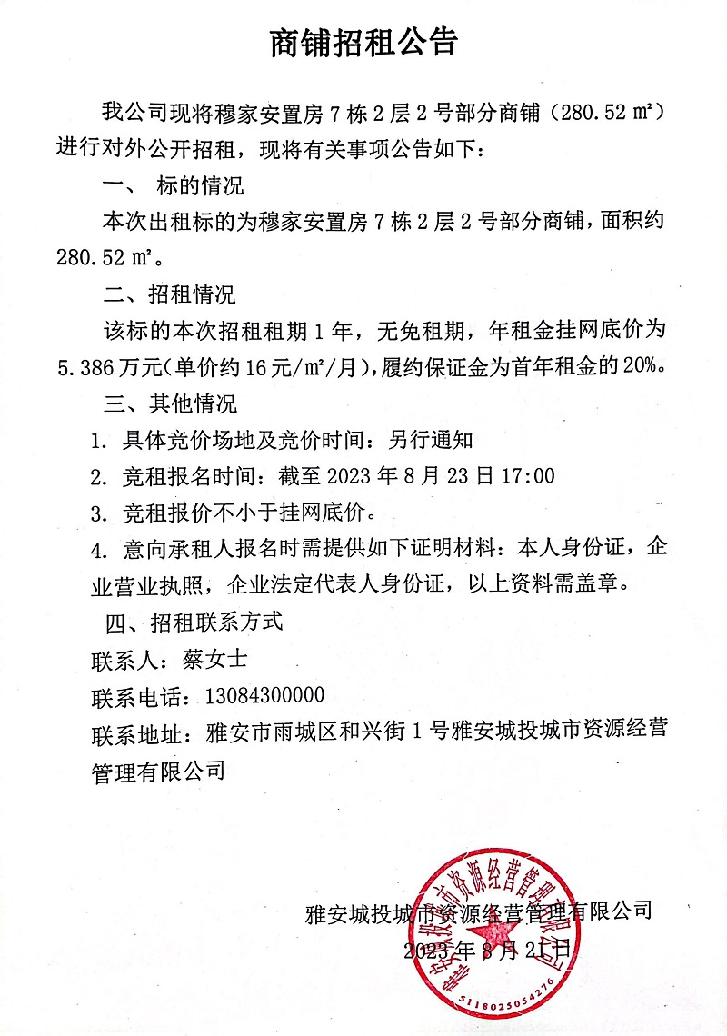 穆家安置房7棟2層2號部分商鋪招租公告