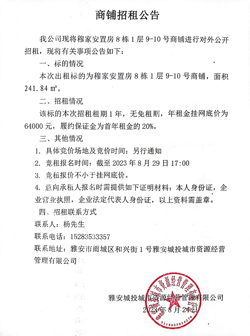 穆家安置房8棟1層9-10號(hào)商鋪招租公告