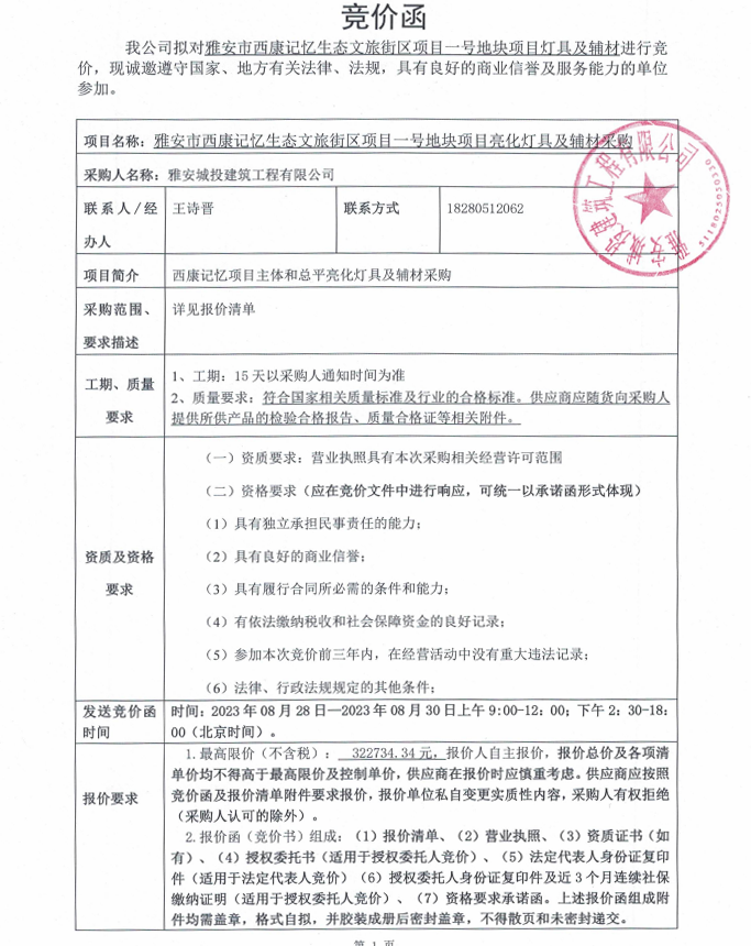 雅安市西康記憶生態(tài)文旅街區(qū)項(xiàng)目一號(hào)地塊項(xiàng)目燈具及輔材競(jìng)價(jià)采購(gòu)公告