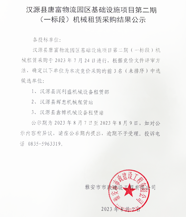 漢源縣唐富物流園區(qū)基礎設施項目第二期(一標段)機械租賃采購結(jié)果公示