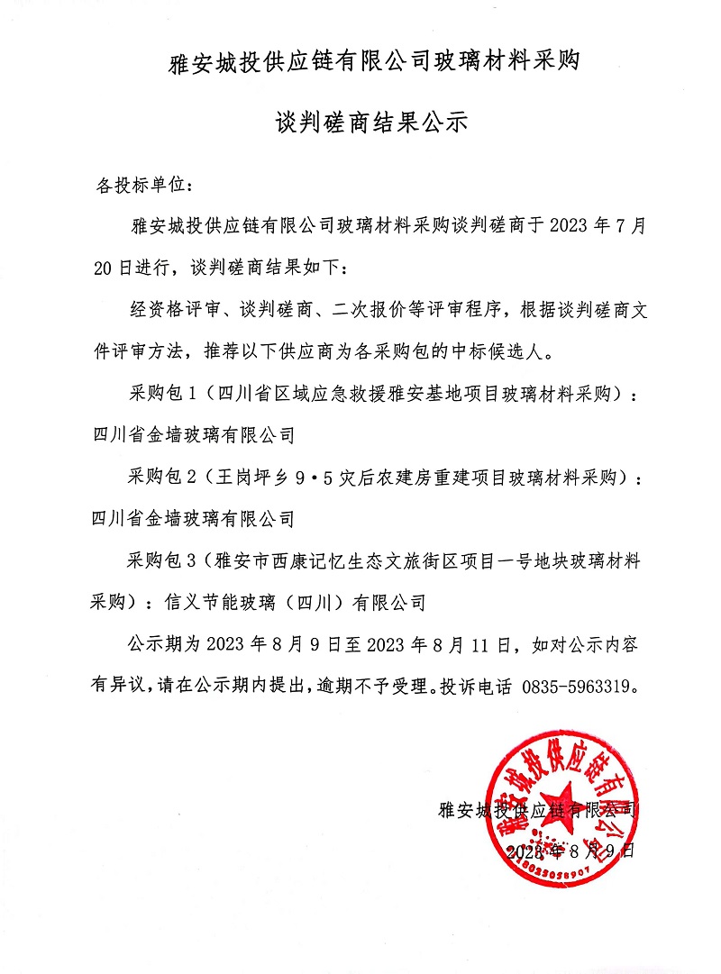 雅安城投供應(yīng)鏈有限公司玻璃材料采購(gòu)談判磋商結(jié)果公示