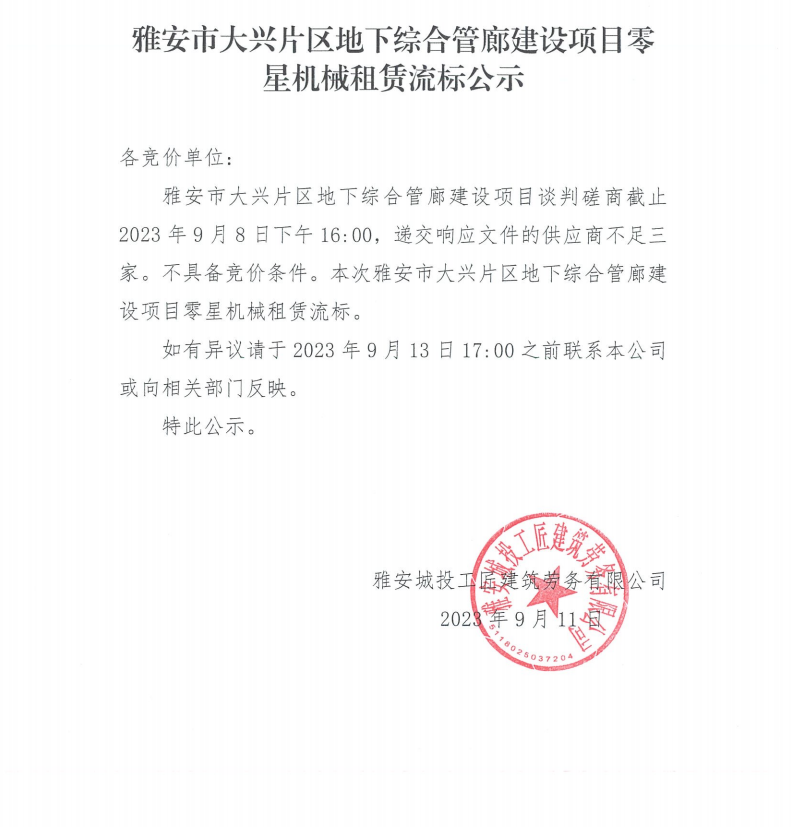 雅安市大興片區(qū)地下綜合管廊建設項目零星機械租賃流標公示