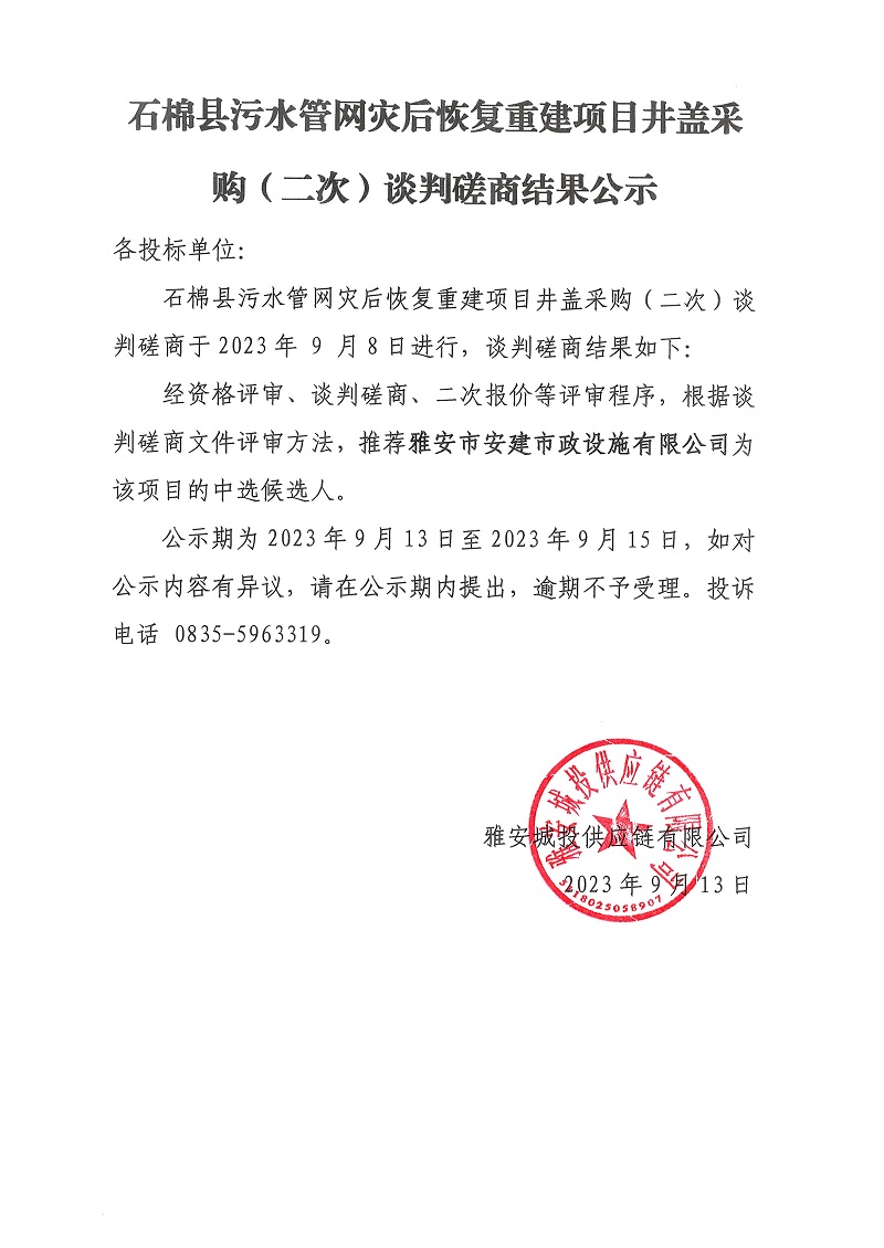 石棉縣污水管網(wǎng)災(zāi)后恢復(fù)重建項(xiàng)目井蓋采購(二次)談判磋商結(jié)果公示
