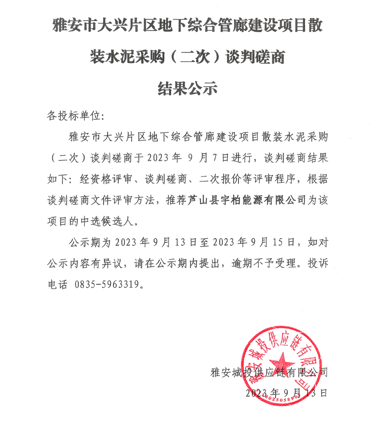 雅安市大興片區(qū)地下綜合管廊建設(shè)項(xiàng)目散裝水泥采購(gòu)(二次)談判磋商結(jié)果公示