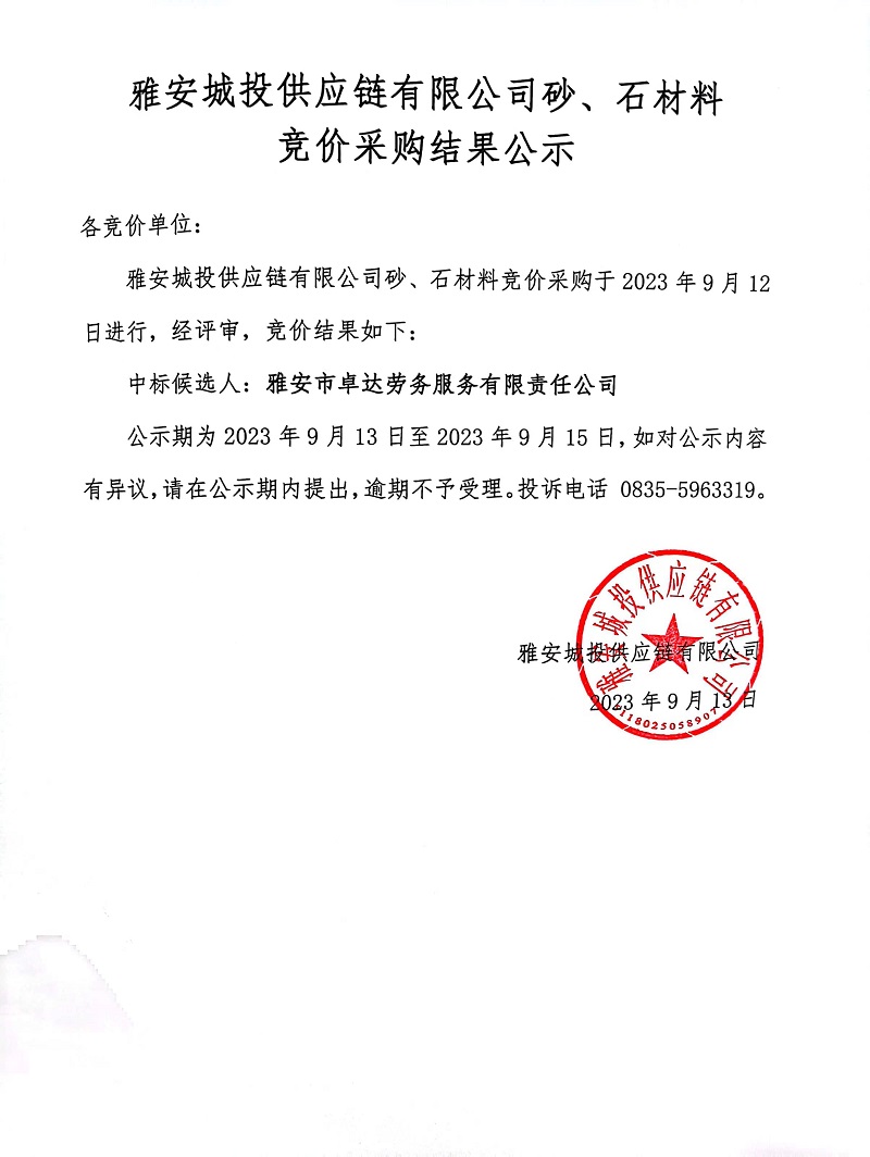 雅安城投供應鏈有限公司砂、石材料競價采購結(jié)果公示