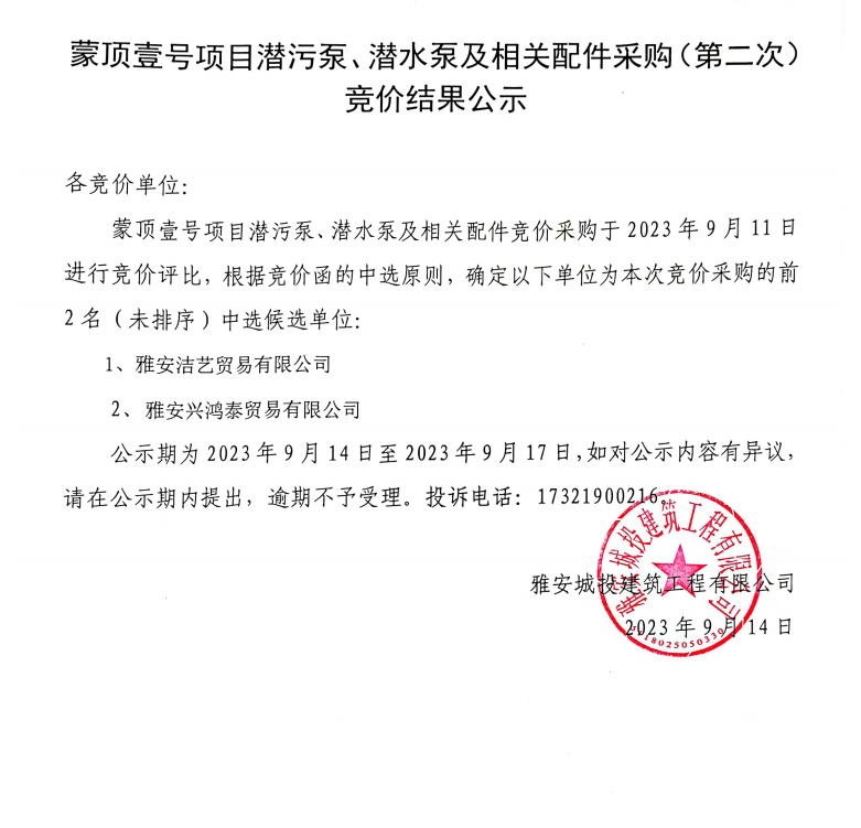 蒙頂壹號項目潛污泵、潛水泵及相關配件采購(第二次)競價結(jié)果公示