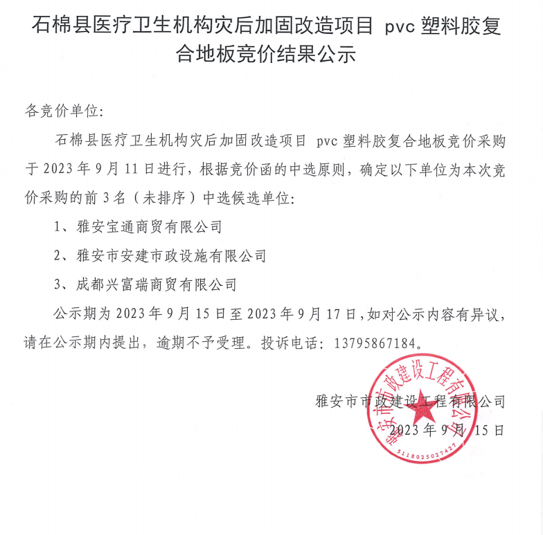 石棉縣醫(yī)療衛(wèi)生機(jī)構(gòu)災(zāi)后加固改造項(xiàng)目pvc塑料膠復(fù)合地板采購(gòu)競(jìng)價(jià)結(jié)果公示