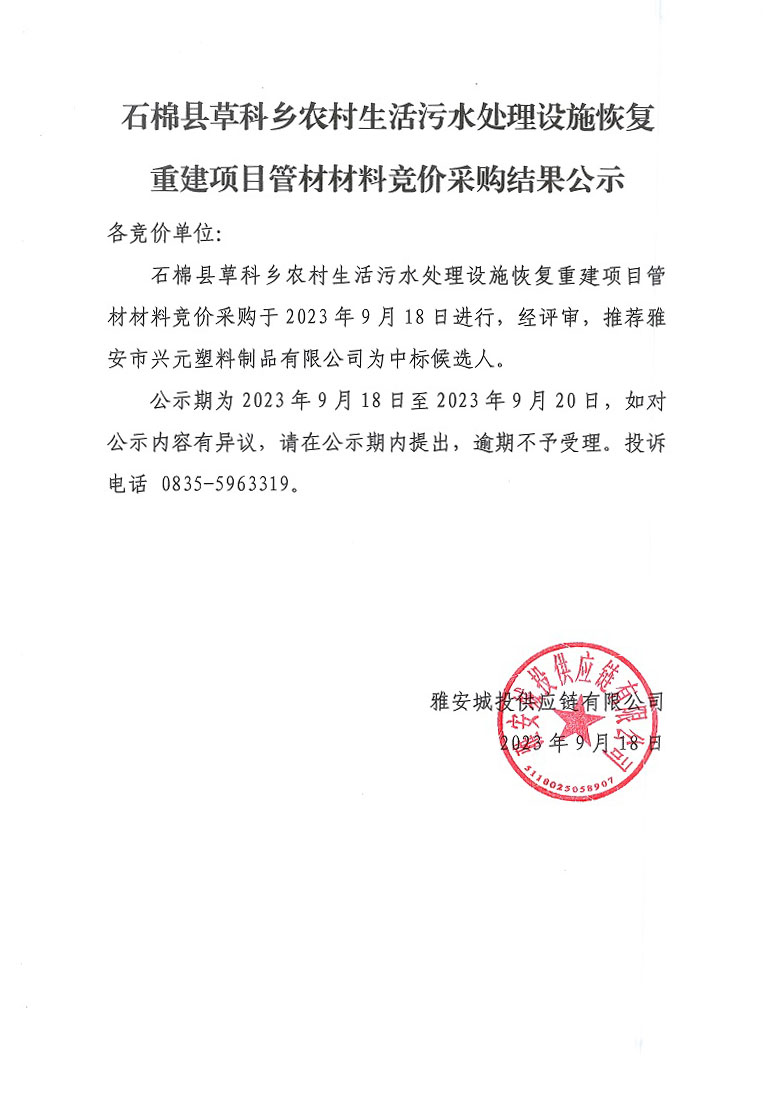 石棉縣草科鄉(xiāng)農(nóng)村生活污水處理設(shè)施恢復(fù)重建項(xiàng)目管材材料競(jìng)價(jià)采購(gòu)結(jié)果公示