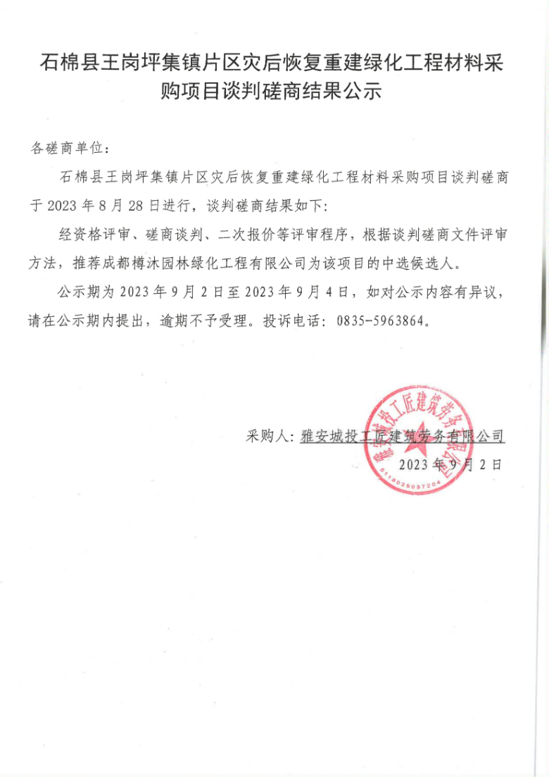 石棉縣王崗坪集鎮(zhèn)片區(qū)災(zāi)后恢復(fù)重建綠化工程材料采購項(xiàng)目談判磋商結(jié)果公示