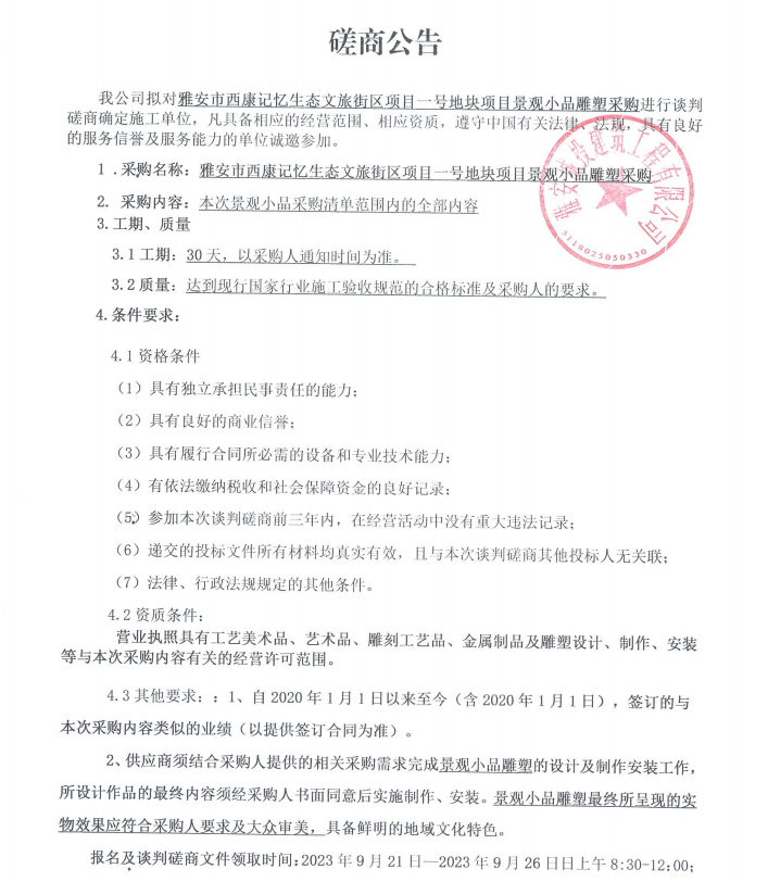 雅安市西康記憶生態(tài)文旅街區(qū)項目一號地塊項目景觀小品雕塑采購談判磋商公告
