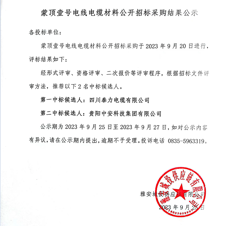 蒙頂壹號電線電纜材料公開招標采購結果公示